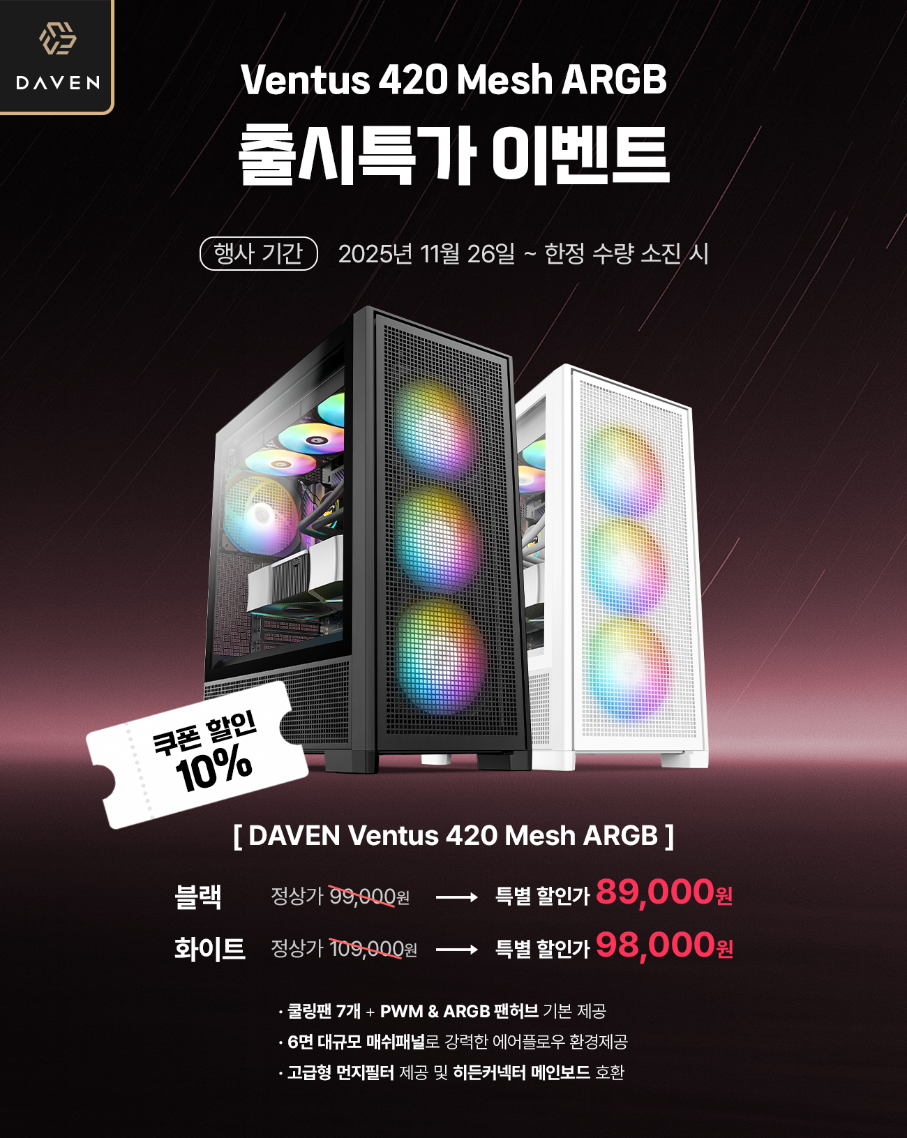 [특가진행]데이븐 프리미엄급 미들타워 케이스 신제품 VENTUS 420 MESH ARGB 출시 특가 2차 진행데이븐에서는 프리미엄급 미들타워 케이스 신제품 VENTUS 420 MESH ARGB 출시 특가 2차 행사를 진행합니다.