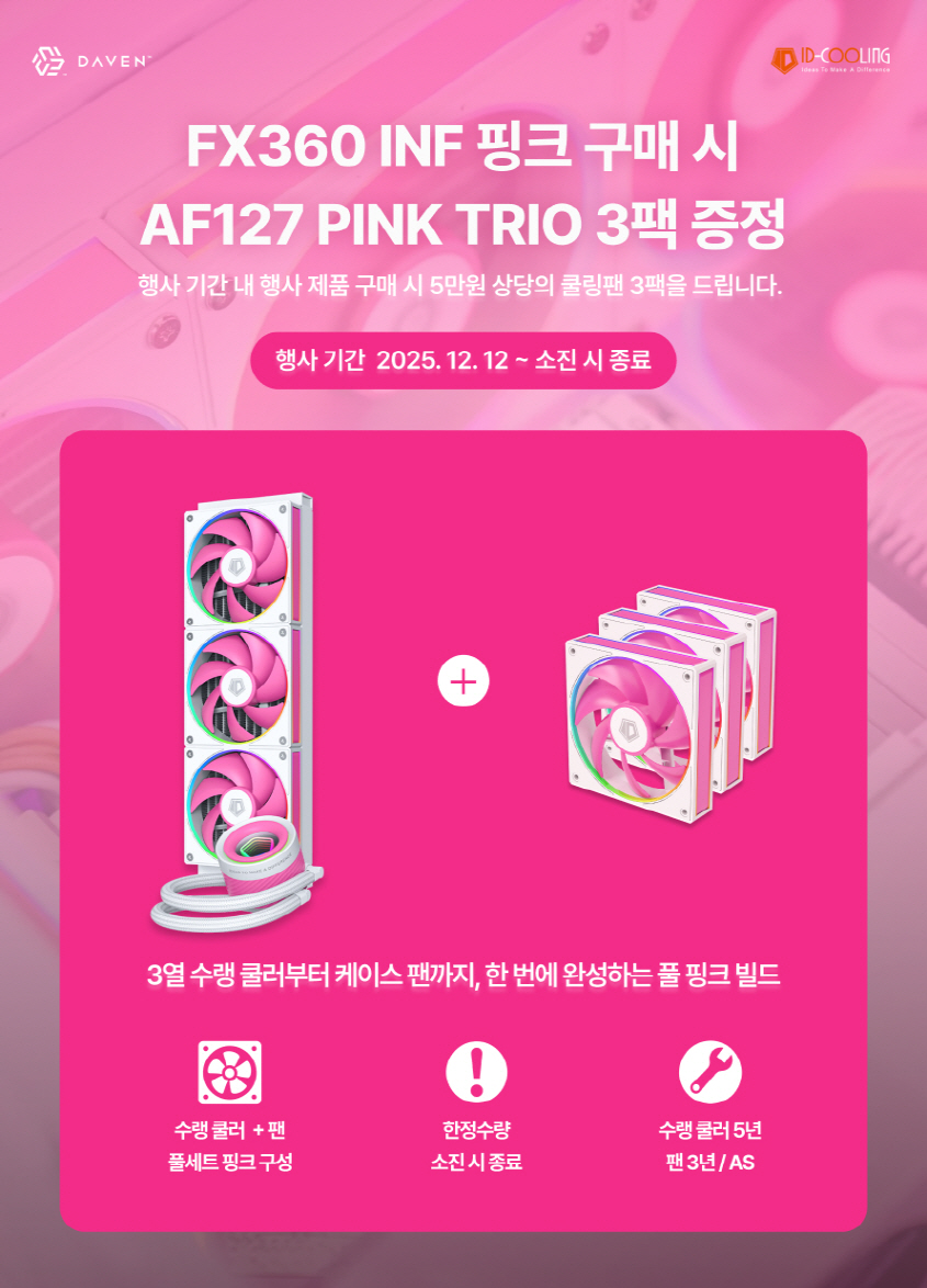 ID-COOLING, FX360 INF 핑크 구매 시 AF127 PINK TRIO 3팩 증정 연말 사은품 행사 진행컴퓨터 쿨링 솔루션 전문 브랜드 ID-COOLING이 2025년 연말을 맞아, 핑크 감성 PC 빌드를 원하는 소비자를 위한 특별 사은품 이벤트를 진행합니다.