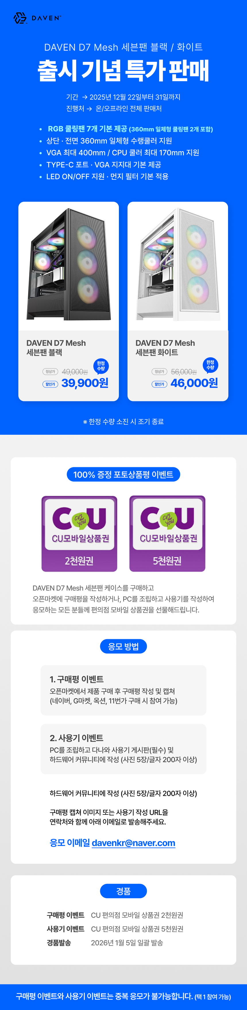 가성비 케이스의 새로운 기준이 될 DAVEN D7 Mesh 세븐팬에 많은 관심 부탁드립니다.