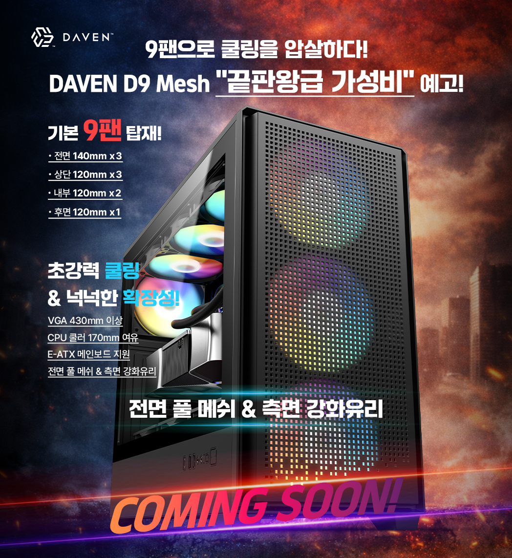 [출시예정] 9팬으로 쿨링을 압살하다, DAVEN D9 Mesh "끝판왕급 가성비" 예고!안녕하세요. 하드웨어에 관심을 가져주시는 여러분께 새로운 소식을 전해드립니다.