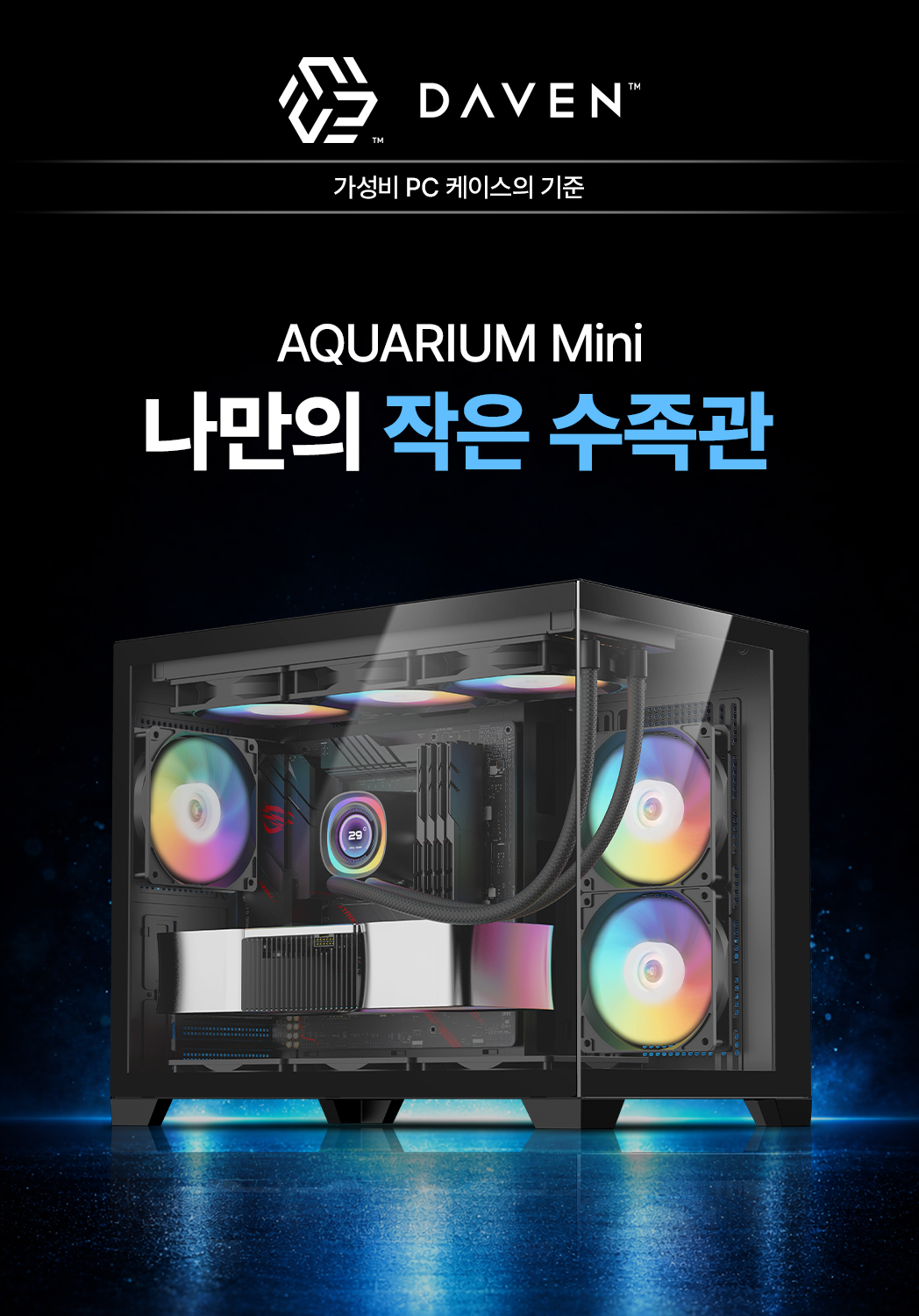 DAVEN AQUARIUM MINI는 전면과 측면에 투명 강화유리를 적용한 쇼케이스형 미니타워 케이스, 컴팩트한 크기에서도 탁 트인 개방감과 뛰어난 튜닝 효과를 느끼실 수 있도록 설계된 제품입니다.